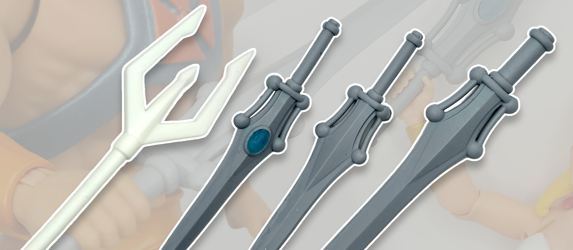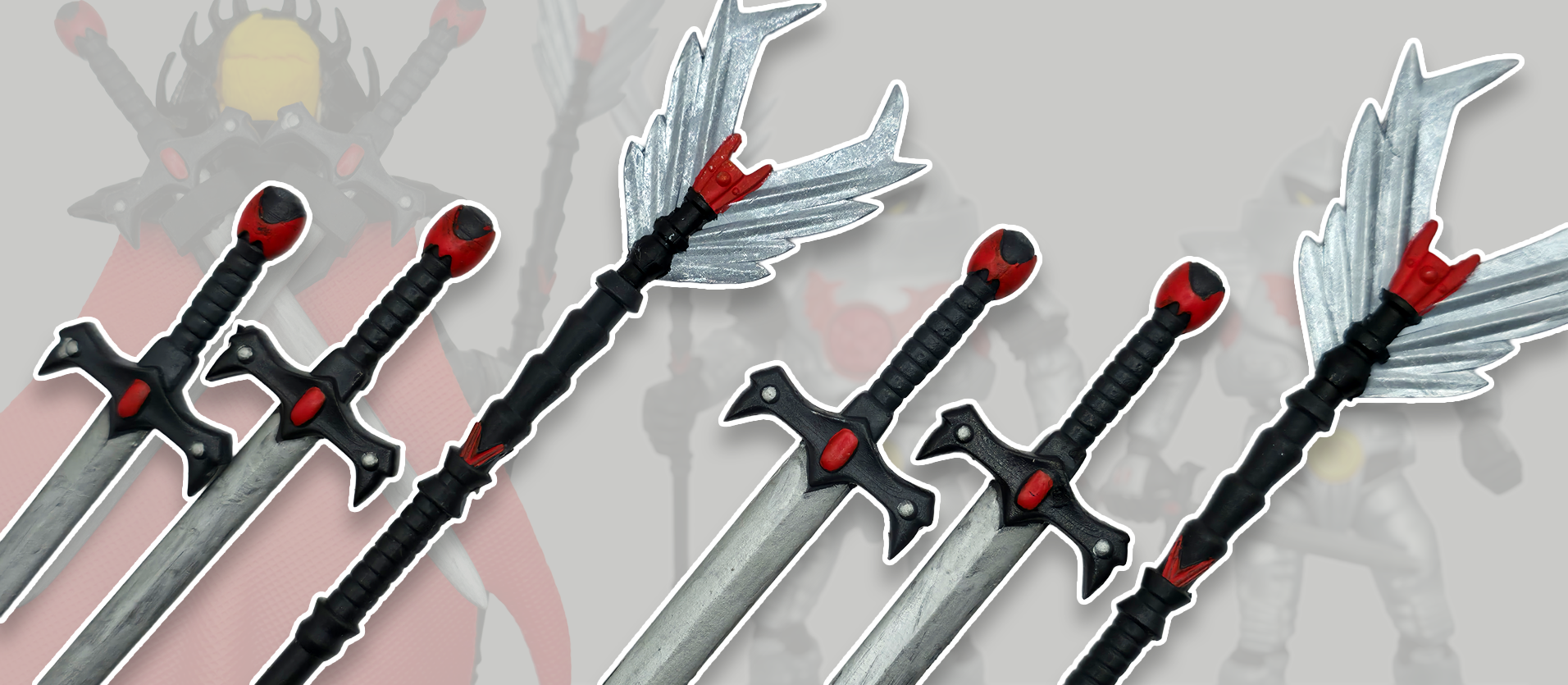 A collection of POWERFUL SWORDS! Twin blades for 5.5 Retro figures and a Massive one for 7” Scale! And a proper standard-issue staff for your favorite guardsmen!
