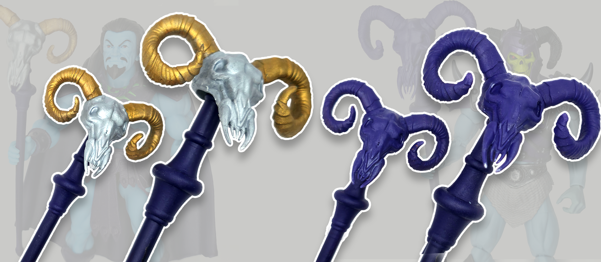 Two variations of this ominous totem of evil: one for 5.5 Retro figures and a Massive one for 7” Scale! AND with removable ram’s heads, the 7” Scale is useable as an action figure head for 5.5 Retro & 7” Scale figures!
